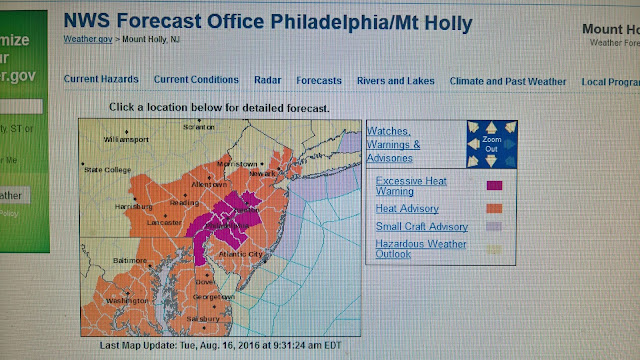 The excessive heat warning from the past 5 days has been extended until today. Notice in this map how the humidity is higher here then points South which is why we are under a warning and other areas a less severe advisory.